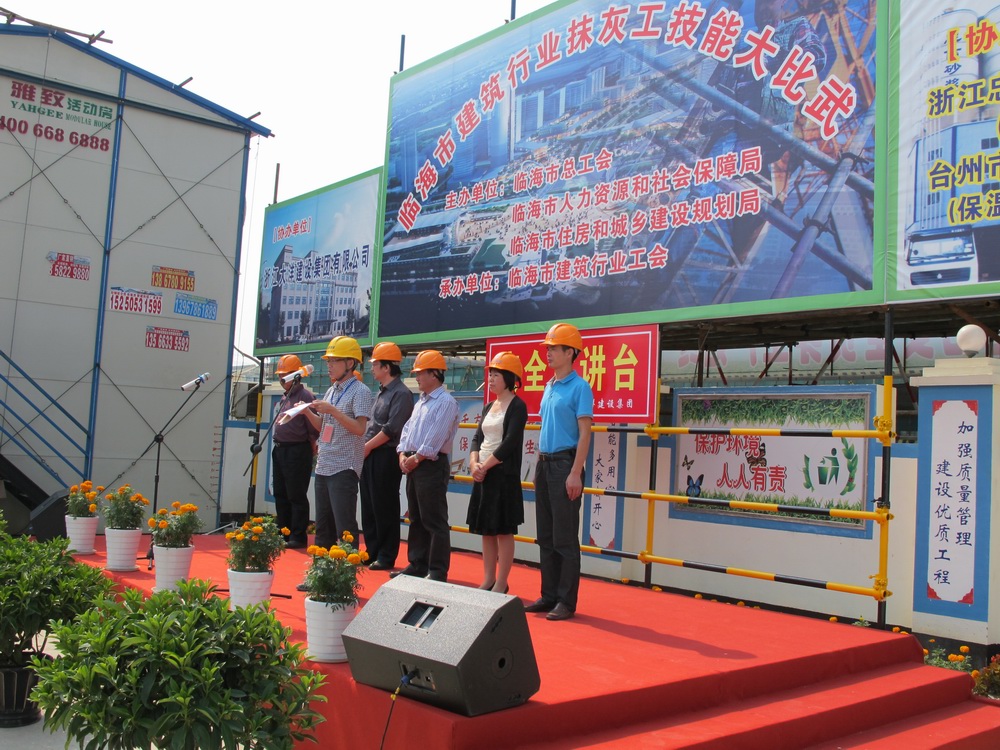 918,臨海市建筑行業(yè)抹灰工技能比武大賽在浙江天一交通建設(shè)有限公司1#2#廠房項目工地舉行。出席此次活動的領(lǐng)導(dǎo)有:臨海市政協(xié)副主席、市總工會主席李昌長,臨海市總工會黨組書記、常務(wù)副主席陳麗梅,臨海市總工會副主席胡義偉,臨海市住房和城鄉(xiāng)建設(shè)規(guī)劃局副局長、市建筑行業(yè)工會主席王黎明,臨海市人力資源和社會保障局黨委委員王正強等。