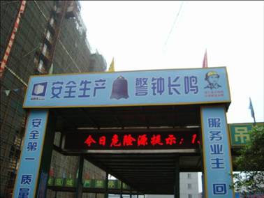 1、現(xiàn)場入口醒目處設(shè)置LED電子顯示屏,滾動播放今日重大危險源,促進現(xiàn)場安全宣傳和提醒。