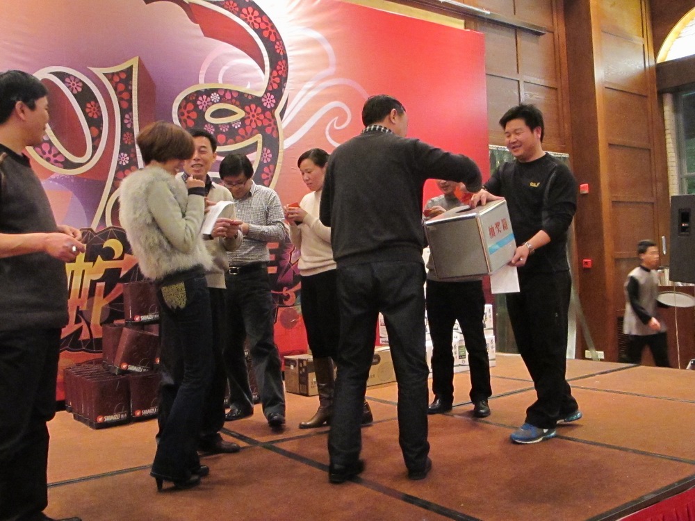 席間大家相談甚歡,觥籌交錯間熱鬧非凡。除了豐盛的美食,此次晚宴還保留了傳統(tǒng)項目——“神秘大抽獎”活動。與往年不同的是,這次的“神秘大抽獎”活動除了設(shè)置三等獎六十個名額、二等獎十個名額、一等獎五個名額外,還特別增設(shè)了兩名特等獎,獎品為蘋果平板電腦。最后,項目經(jīng)理張閑輝和工程部的吳杰喜獲特等獎。