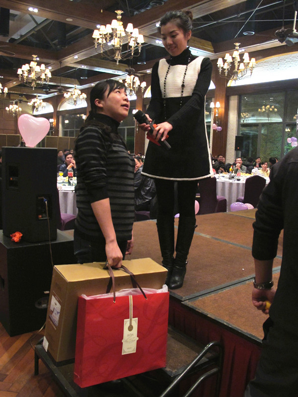 年會,最令人期待、最激動人心的時刻是抽獎環(huán)節(jié)。放眼望去,臺上擺滿了獎品,一等獎為mini ipad,二、三等獎均為價值不菲的名牌家紡。每個人都做好了心理準備,默祈大彩頭降臨自己。此外,為了增加抽獎的喜慶氣氛,今年的晚宴還別出心裁,規(guī)定中獎?wù)唔毣卮鸪鲋鞒秩颂岢龅膯栴}或者即興表演一個節(jié)目后才能領(lǐng)取獎品。但這并沒有難倒我們的獲獎?wù)撸麄?/span>或詩歌朗誦,或民族舞表演,或引吭高歌,絲毫不怯場,熱情參與的氛圍讓晚宴的氣氛達到了高潮。