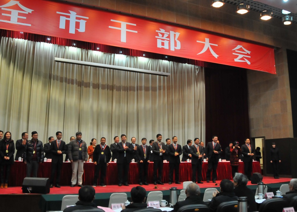 2014年2月12日,臨海市人民政府召開全市干部大會(huì),大會(huì)向集團(tuán)董事長邵全臻授予“二〇一三年度臨海市功勛企業(yè)家”稱號(hào)。 圖為集團(tuán)董事長邵全臻(右一)上臺(tái)領(lǐng)獎(jiǎng)