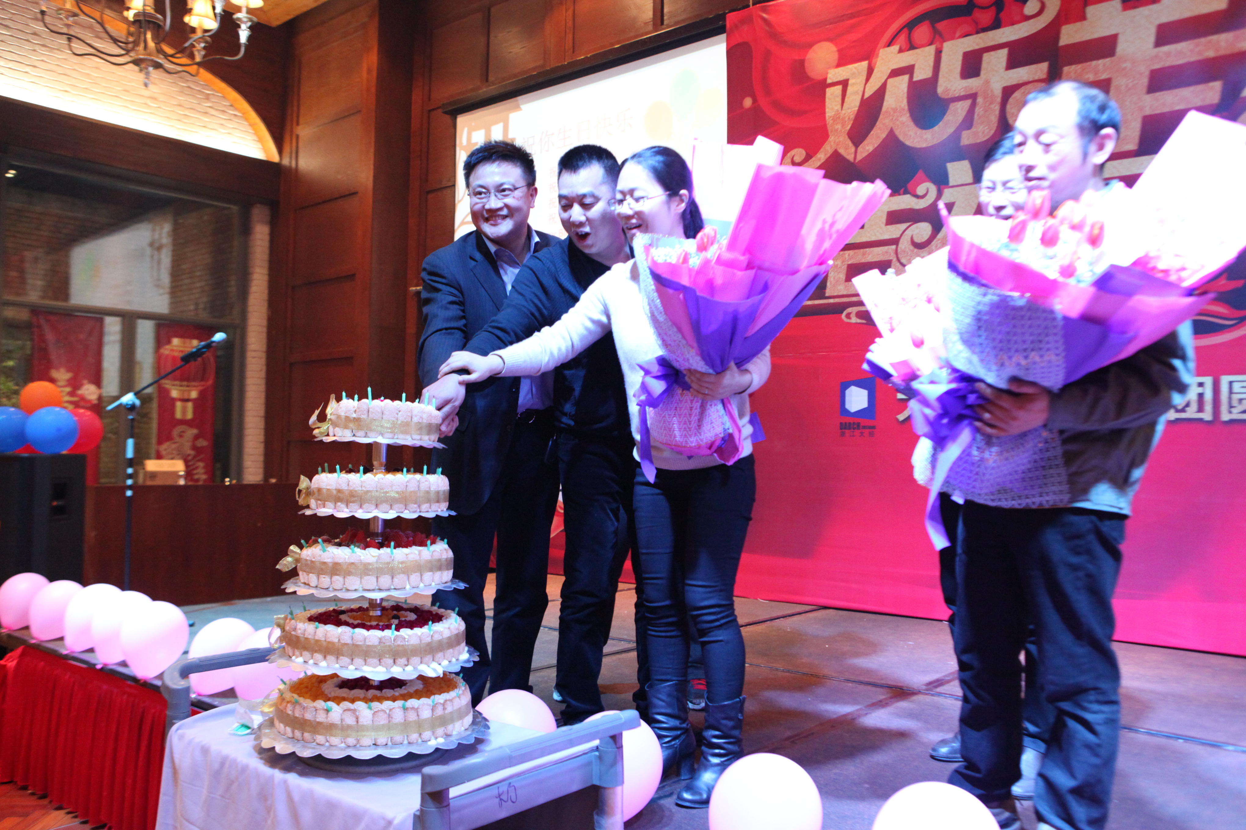 當(dāng)晚,最溫馨最感人的場(chǎng)面當(dāng)屬公司為二月份生日的員工秘密安排的生日會(huì)。大家正舉杯暢飲、交談甚歡時(shí),現(xiàn)場(chǎng)的燈光突然暗下來(lái),正當(dāng)大家感覺(jué)一頭霧水時(shí),熟悉的生日歌響起,宴會(huì)廳的大門(mén)被打開(kāi),晚會(huì)工作人員們?cè)诒娙藷崃移诖难凵裰校峙貂r花和生日卡片,緩緩將一個(gè)精美的五層生日蛋糕推至晚會(huì)中央。邵總和壽星們被邀上舞臺(tái),共同拿起刀叉為大家切分生日蛋糕,頓時(shí),一張張臉龐在燦爛的燈光下綻開(kāi)了幸福的笑容。二月壽星廣益房產(chǎn)副總楊建波拿起話(huà)筒,還特別感慨道:“這個(gè)活動(dòng)非常的有意義,不僅推動(dòng)了企業(yè)的文化建設(shè),還增進(jìn)了員工之間的友誼,我們作為這個(gè)活動(dòng)的受益者,對(duì)于公司的關(guān)懷表示感謝!”