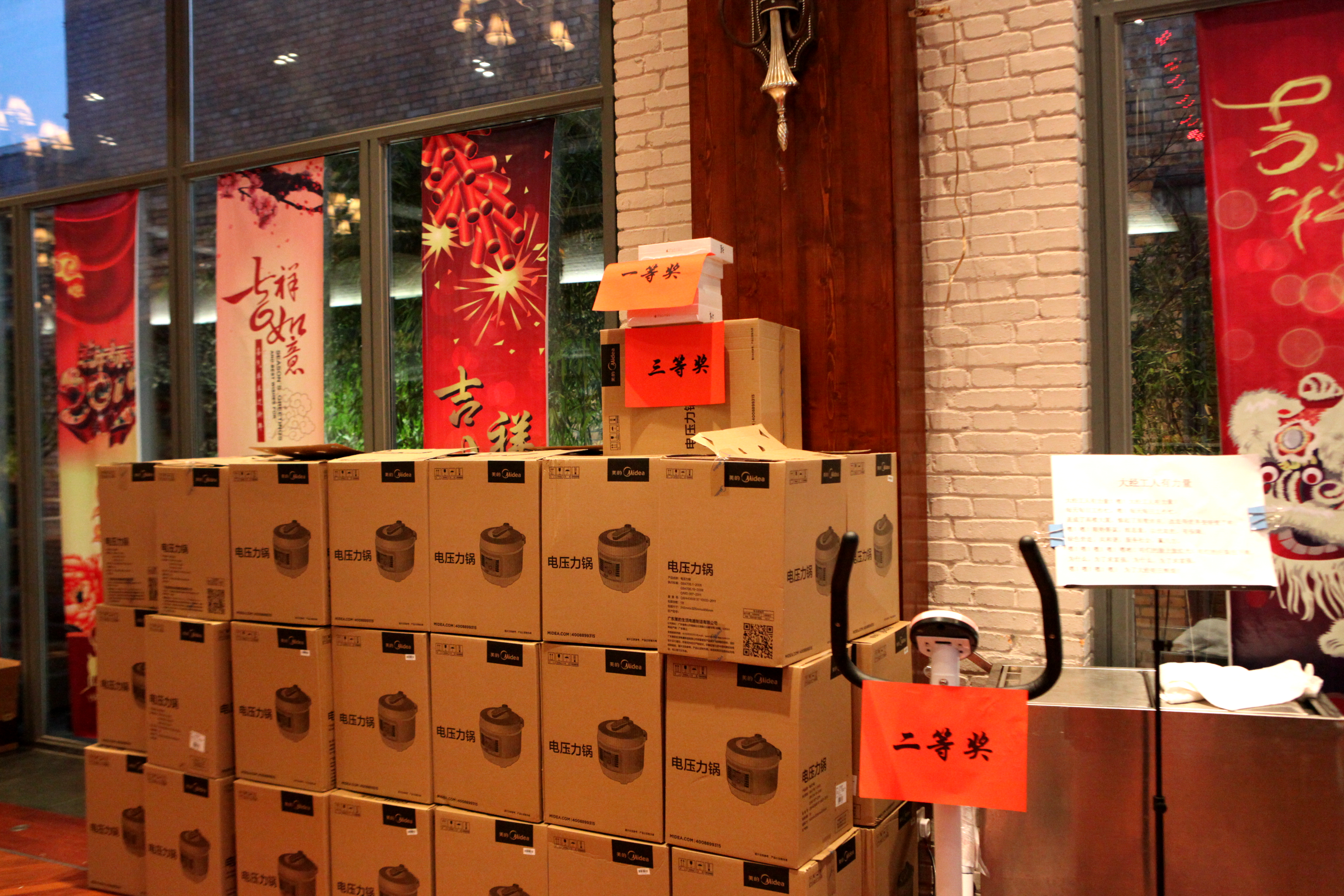 節(jié)目中間還設(shè)置了抽獎(jiǎng)環(huán)節(jié)。堆放在舞臺(tái)一側(cè)的各項(xiàng)大獎(jiǎng),惹得大家紛紛摩拳擦掌,就等著被抽中一份抱回家了,今年的獎(jiǎng)品不僅分量重而且數(shù)量充足,一等獎(jiǎng)是MINI IPAD,二等獎(jiǎng)是健身單車(chē),三等獎(jiǎng)是美的電壓力鍋。而且,經(jīng)高層領(lǐng)導(dǎo)提議,今年還特設(shè)了現(xiàn)金獎(jiǎng),即凡有高層領(lǐng)導(dǎo)被抽中的,將拿出與獎(jiǎng)品等額的現(xiàn)金作為現(xiàn)金獎(jiǎng)供大家抽取,這就大大加大了我們的中獎(jiǎng)概率,使今年的中獎(jiǎng)率近乎100%。每當(dāng)現(xiàn)場(chǎng)有人被抽中時(shí),在場(chǎng)所有人都會(huì)為幸運(yùn)者歡呼、祝賀,舉杯相慶之間,快樂(lè)洋溢在了每個(gè)人的臉上、心中。