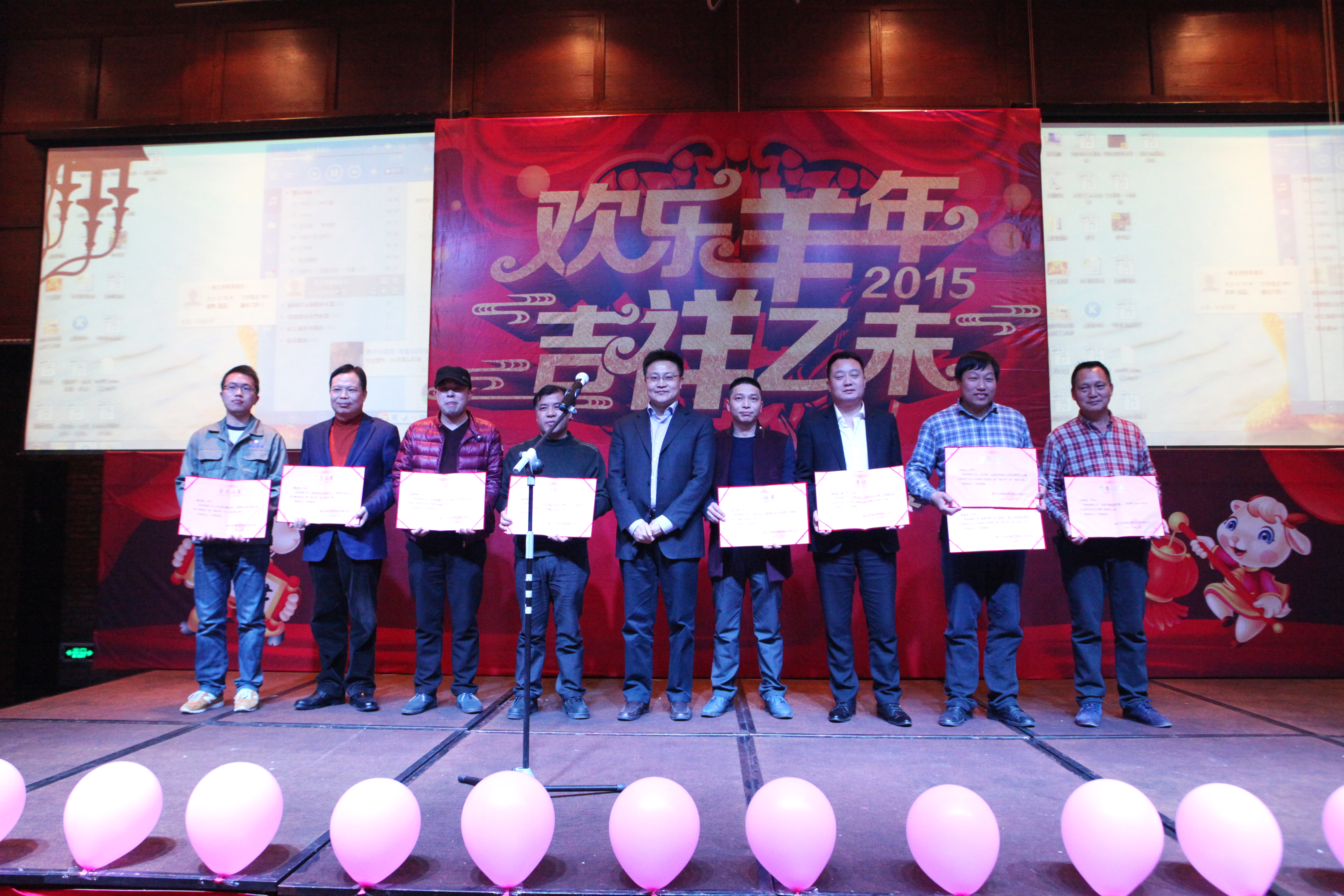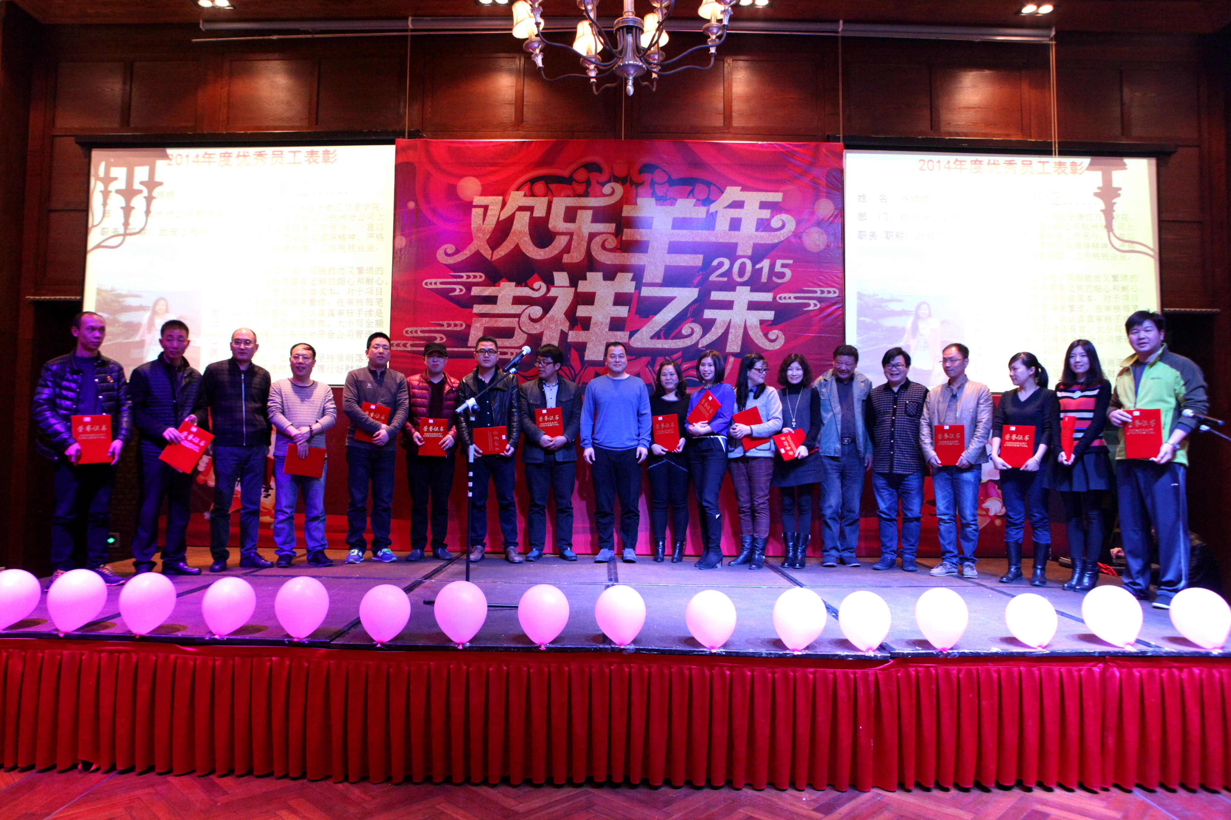 2014年度大經(jīng)公司優(yōu)秀員工的照片跟先進(jìn)事跡的PPT在幻燈片上滾動(dòng)著,讓優(yōu)秀員工成為今晚最閃耀的明星不僅體現(xiàn)了創(chuàng)新的激勵(lì)方式,更重要的是唱響了和諧的樂(lè)府。在喜慶莊重的音樂(lè)中,9個(gè)獲得2014年度省級(jí)獎(jiǎng)以上工程的項(xiàng)目負(fù)責(zé)人、18名2014年度公司 “優(yōu)秀員工”分批邁上了舞臺(tái),領(lǐng)取了屬于他們的榮譽(yù),一時(shí)間張張獎(jiǎng)狀輝映起燦爛笑容。