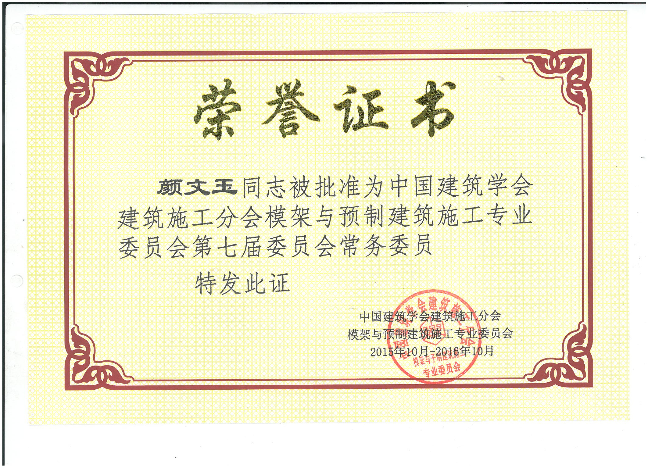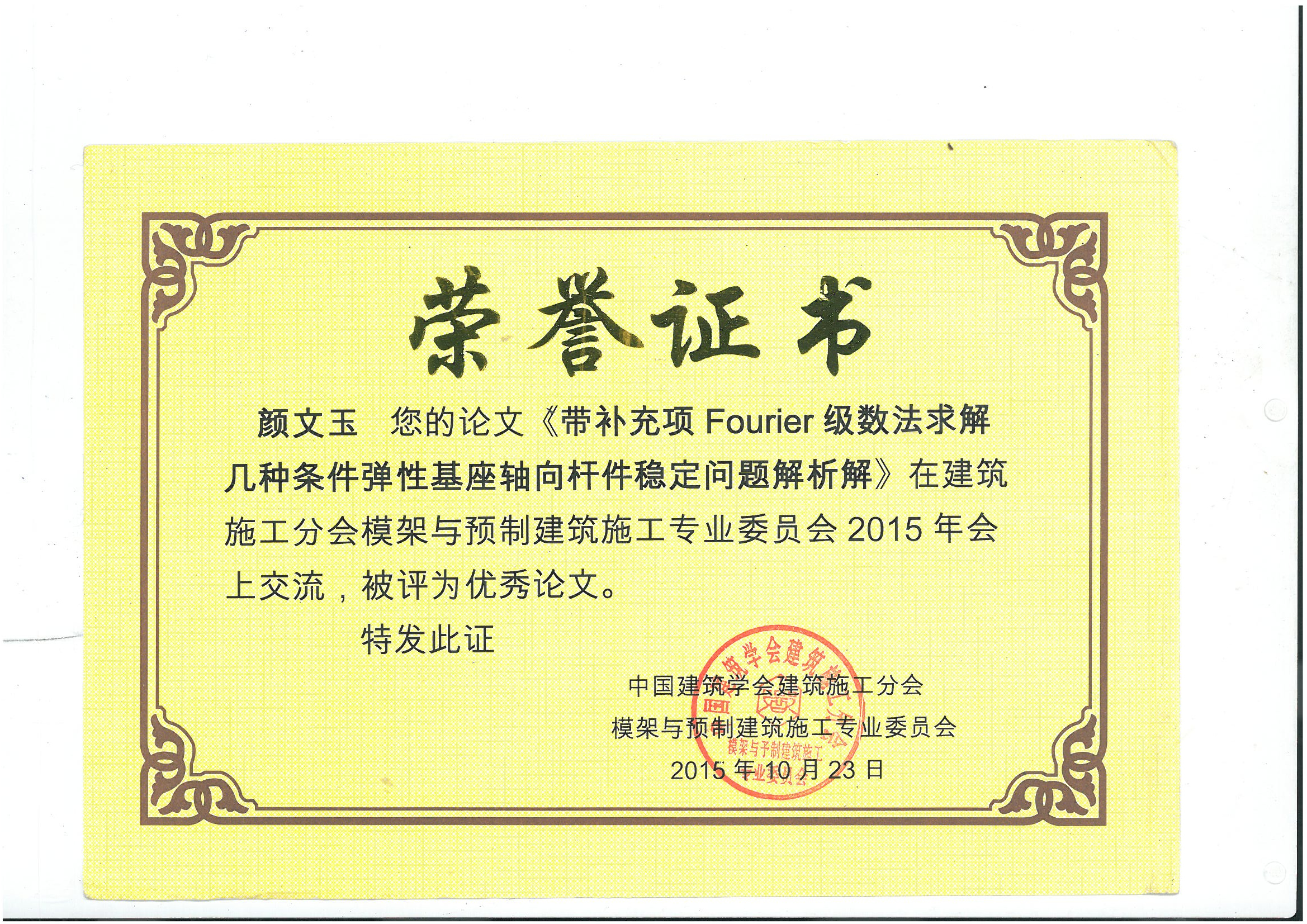 年會上,我公司被選為中國建筑學會建筑施工分會模架與預(yù)制建筑施工專業(yè)委員會會員單位;同時我公司顏文玉同志被批準為中國建筑學會建筑施工分會模架與預(yù)制建筑施工專業(yè)委員會第七屆委員會常務(wù)委員,其論文《帶補充項Fourier級數(shù)法求解幾種條件彈性基座軸向桿件穩(wěn)定問題解析解》被評為優(yōu)秀論文。